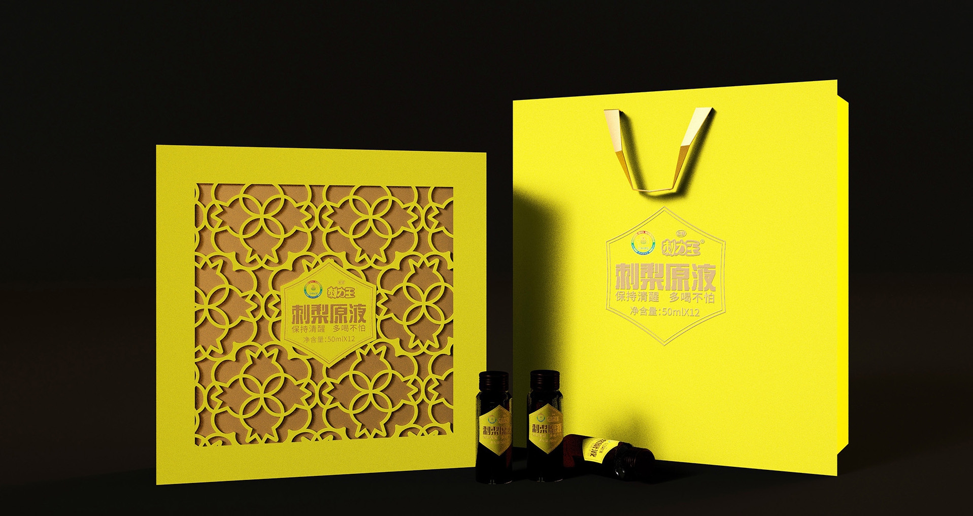 我們對刺力王進(jìn)行了包裝設(shè)計(jì)升級,保留了刺梨元素,并對其進(jìn)行改良運(yùn)用,由原有的具象的插畫提取輪廓設(shè)計(jì)成紋樣,用剪紙的形式表現(xiàn)在包裝上,簡約不失精致。