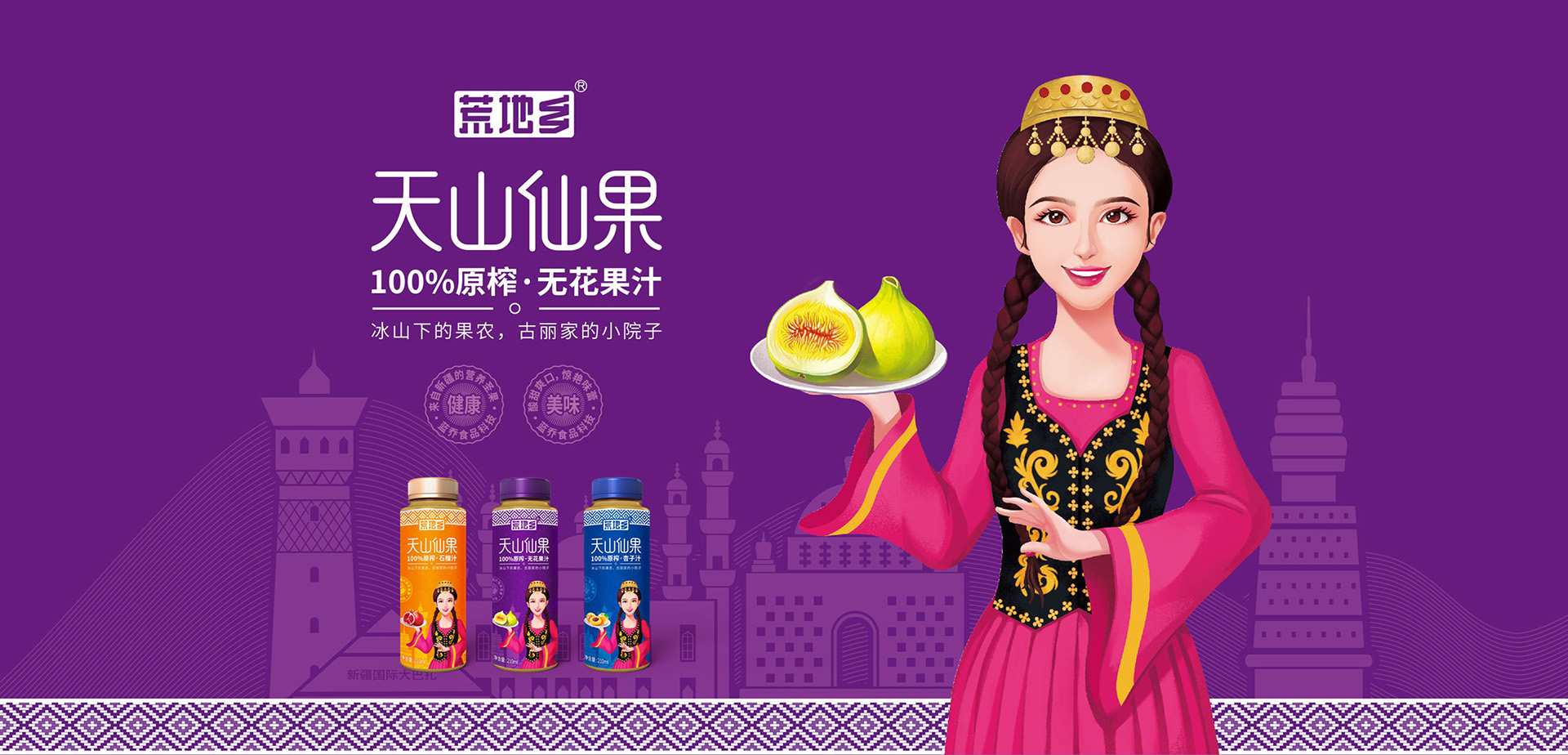 新疆喀什位于天山南麓,品名中有“天山”一詞使人更容易聯(lián)想到“新疆”的原產(chǎn)地概念。 無花果一直都有“菩提圣果”“品仙果”等稱號(hào)。 一名新疆少女手拿無花果,好像在說:“歡迎您到新疆來!”——不僅強(qiáng)調(diào)了“來自新疆”的概念,而且能使產(chǎn)品更有親和力。 美麗而熱情的新疆少女如同“仙子”一般,同“仙果”的稱號(hào)緊密契合。